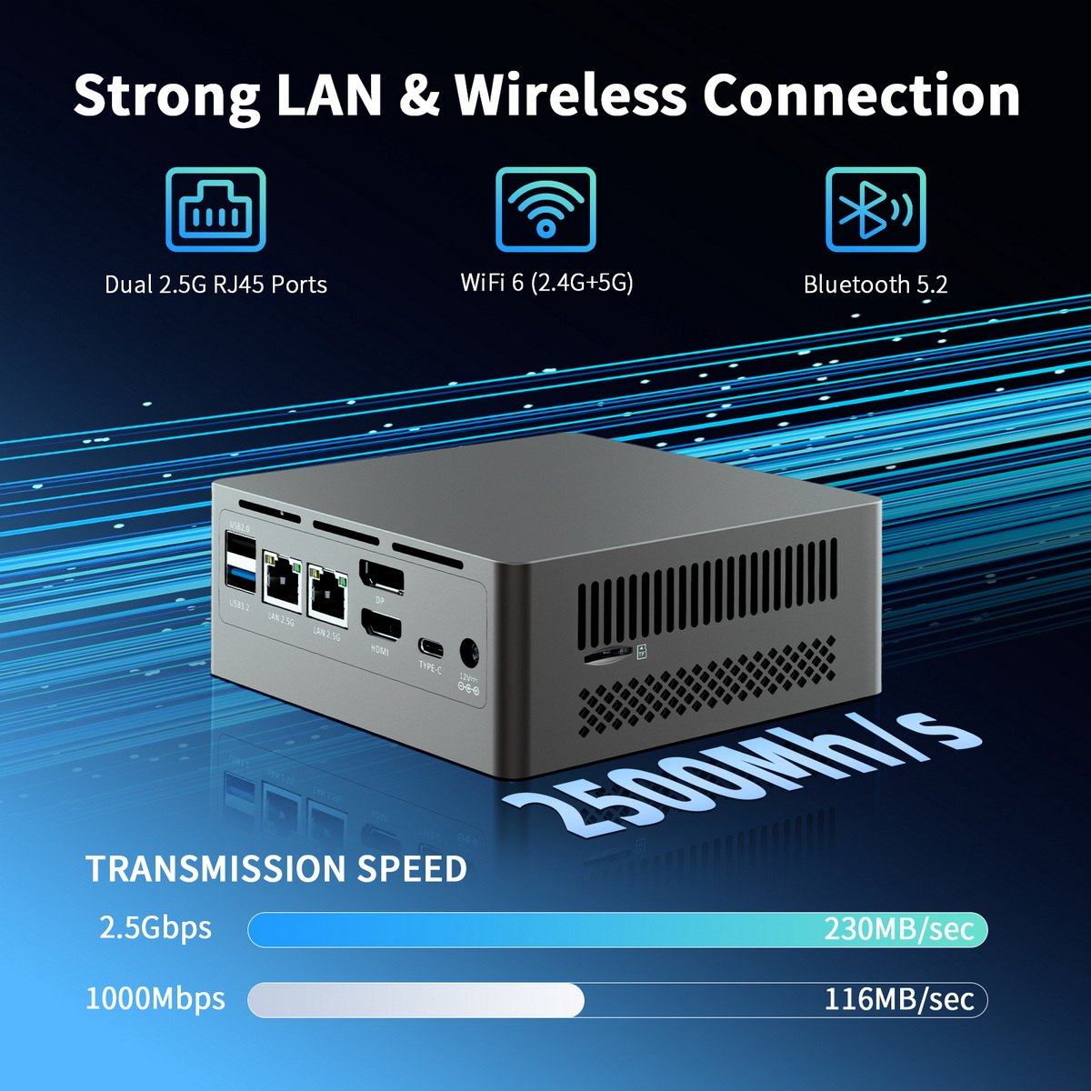 DUAL 2.5G LAN: Mini computer dual LAN Ethernet port design(2 x 2.5Gbps) ensures high-speed data transmission to meet your different uses, such as soft routing, high security firewall or NAS device etc