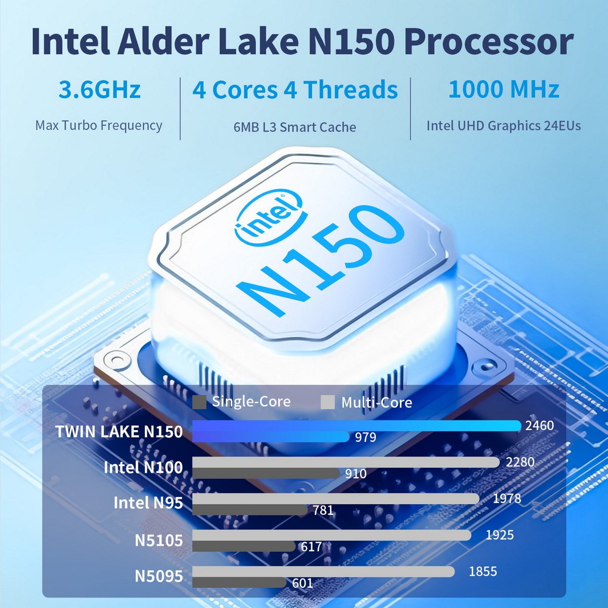 RELIABLE N150 PROCESSOR: Equipped with the latest 13th Intel Twin Lake N150 (Up to 3.6 GHz, 4 Cores/4 Threads, 6 M Smart Cache), as an upgrade of the Alder Lake N100 and N95 processor, the N150 offers an overall performance improvement of 10% and 15%, this mini pc offers more reliable and responsive performance than N100, N95, N5105, N5095, N5100, J4125. Transition effortlessly between tasks like office, streaming entertainment, and browsing the internet without interruptions