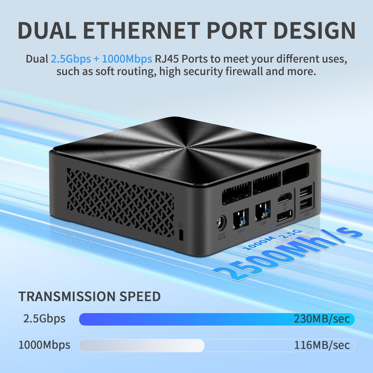 DUAL 1G 2.5G RJ45 PORTS: Mini computer Dual LAN Ethernet port design(1 x 2.5Gbps, 1 x 1000 Mbps) ensures high-speed data transmission to meet your different uses, such as soft routing, high security firewall, server or NAS device etc