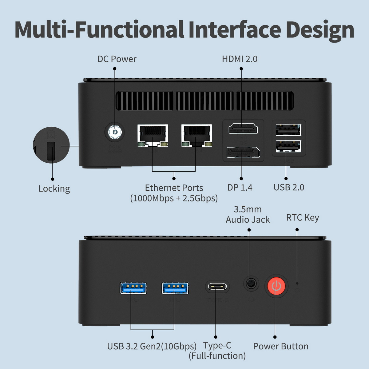 MODERN HIGH-SPEED PORTS: This micro pc comes with 2 x USB3.2, 2 x USB2.0, 1 x HDMI2.0, 1 x DP 1.4, 1 x Type-C(full-function), 2 x RJ-45 Ethernet ports( 1 x 1000 Mbps LAN, 1 x 2.5 Gbps LAN), 1 x Audio jack, 1 x DC jack, for greater visibility of your tasks, even across multiple applications